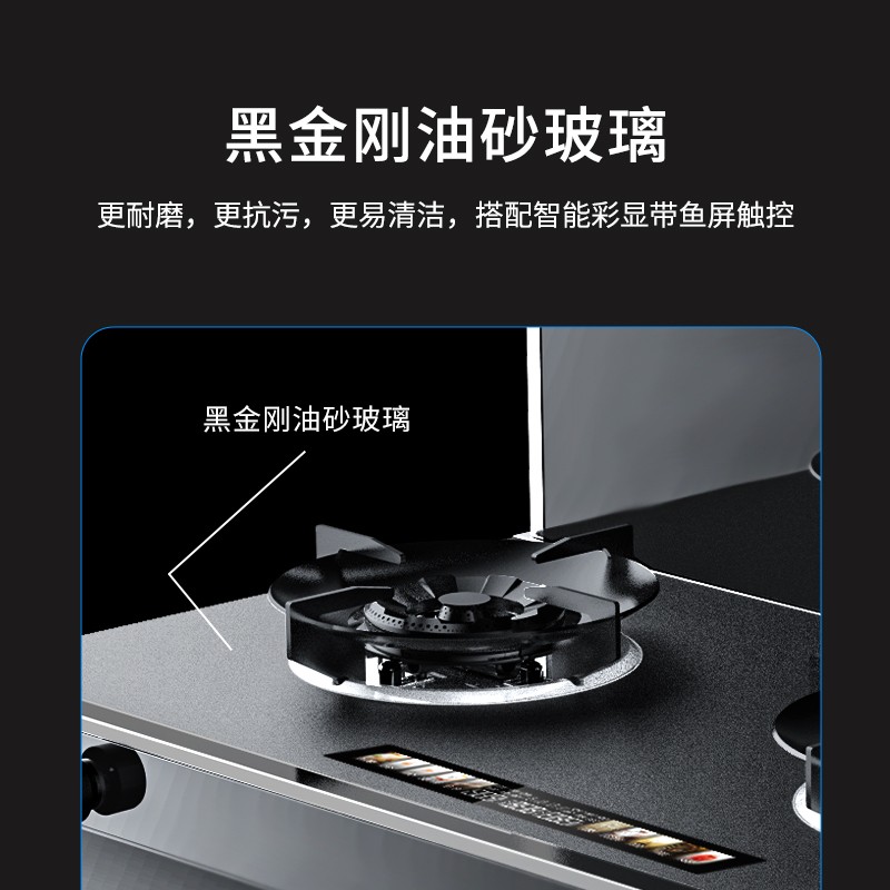 除卻外觀上的美學(xué),臺(tái)面采用黑金剛油砂玻璃材質(zhì),無懼廚房油污,一擦即凈。搭配智能彩顯帶魚屏觸控,整體臺(tái)面質(zhì)感十足。